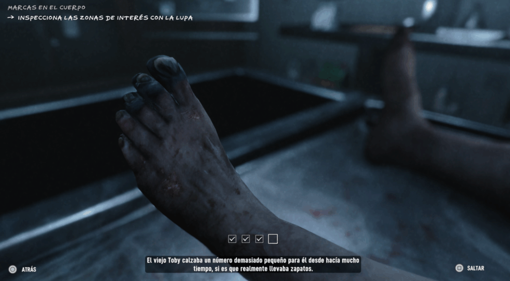 Las autopsias son el corazón del juego (siento la analogía pero no lo podía evitar), y se dividen en fases estrictas pero inmersivas. Todo se hace en primera persona, con controles intuitivos con los que fácilmente podemos desde hacer fotos a partes del cuerpo, abrir cráneos para extraer el cerebro o estudiar en la mesa las vísceras del difunto y sacar conclusiones (que los pulmones presentan color negruzco… tabaquismo, que los análisis de fluidos dan «tal» resultado… alcoholismo, etc, etc) y Jack narra cada paso como un tutorial eterno, lo que es abrumadoramente educativo. Y decimos bien: es hiper-interesante y en muchas ocasiones nos deja con la boca abierta por tanta información real, pero puede llegar a ser un poco/demasiado exhaustivo e intenso.