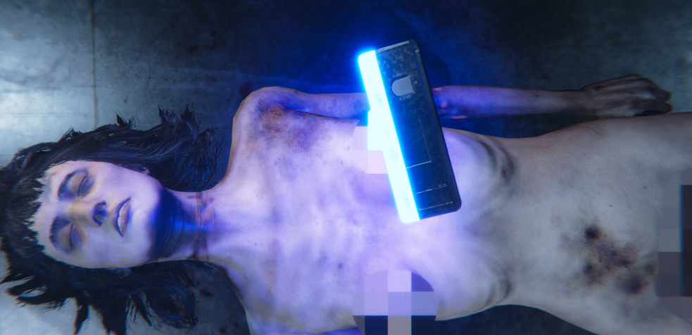 Inspecciona visualmente: busca tatuajes, moretones, rigor mortis o lividez cadavérica. Aquí ya notas gore opcional (borrador de desnudez viene por defecto, así que veremos las partes pudentas pixeladas).