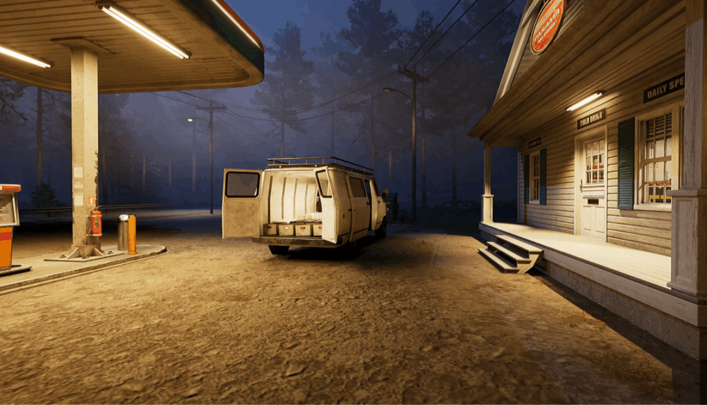Por tanto, debes inspeccionar todo meticulosamente. Día 1: lista de tareas en un tablón. Día 7: cero pistas, pura observación… estás solo. Sal fuera a chequear surtidores, manchas de aceite o clientes fantasma que quieren repostar a última hora. Hay más de 40-48 escenarios únicos: apagar fuegos, cambiar paneles solares, organizar herramientas… Todo interactivo en primera persona, con físicas justitas pero funcionales (a veces girar tornillos es un suplicio, pero añade realismo).