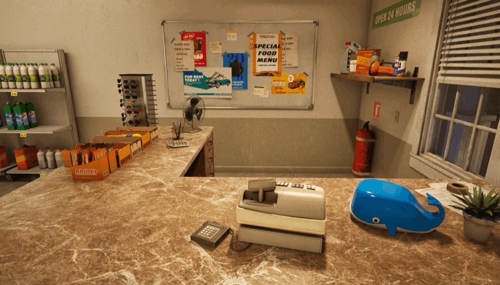 El juego te mete de lleno en el turno de noche de una gasolinera americana clásica: surtidores exteriores, tienda cutre con refrescos, taller mecánico y baños mugrientos. La gasolinera de tus peores sueños: aislada, iluminada solo por neones parpadeantes. Una de esas que tantas veces hemos visto en películas y en cuyo interior parece que pueda suceder cualquier cosa.