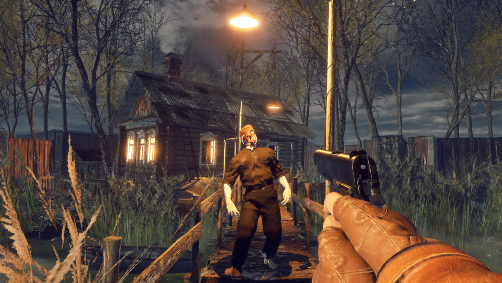 En cuanto a lo jugable, tenemos una de cal y otra de arena. Es un FPS survival horror puro y duro: exploras el pueblo y casas enormes (esto es un poco loco, porque por fuera parecen chozas y por dentro mansiones, esa extraña física soviética ;D), resuelves puzzles de los ’90 tipo «encuentra llave con trébol» o descifra códigos en calendarios del ’97, y gestionas un inventario ultra-limitado (empiezas con 4 slots, pudes aumentar solo hasta 10 y, eso sí, tienes cofres para guardar todo lo que no quieras o puedas llevar encima).