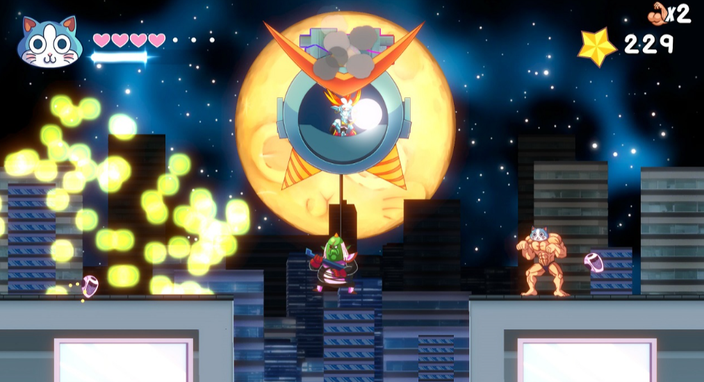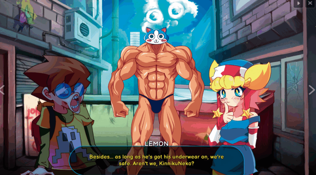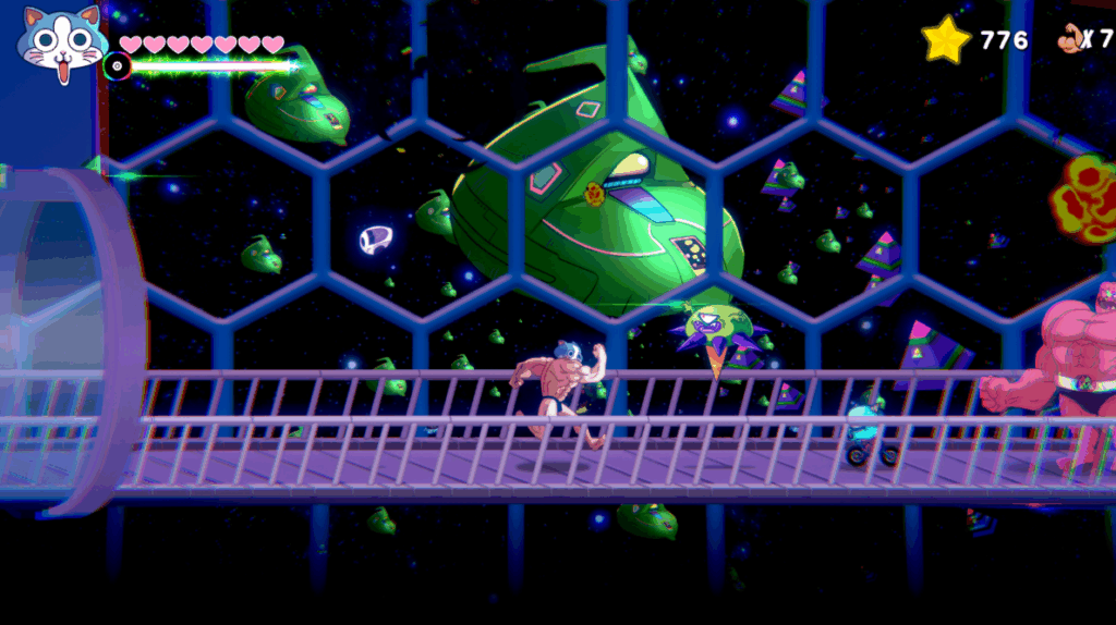 Gráficamente es igual de adorable que un gatito, con su estilo animado vibrante, inspirado en Toriyama y Shantae, con personajes carnosos y expresivos. KinnikuNeko destaca con animaciones fluidas de músculos temblorosos y poses ridículas (super gracioso). Los fondos son simples pero encajan en el rollo retro-anime. Explosiones y efectos por todos lados, aliens que parecen escapados de un concurso de cosplay, con gafas y tentáculos… ¡todo palpita personalidad!