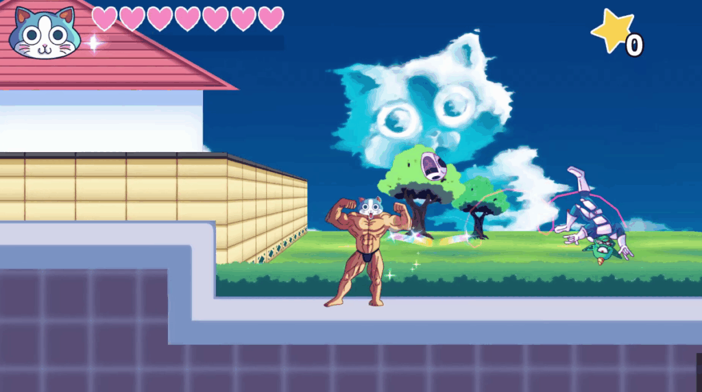 Estamos ante un juegazo indie que es como si un gato se fusionara con Muscleman y decidiera salvar el mundo a base de flexeos y maullidos. Está desarrollado por el todoterreno Kamotachi, un dev de Girona que derrocha talento y humor en cada pixel que crea, y publicado por Mameshiba Games.