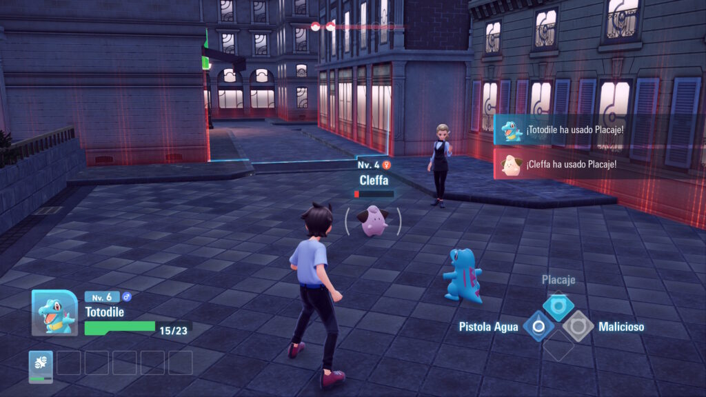 Aprenderemos entonces a combatir, descubriendo que los combates son en tiempo real en esta ocasión, permitiéndonos por un lado mover a nuestro personaje y por otro ir dando ordenes a nuestro Pokémon, con sus cuatro ataques disponibles que se irán recargando para ser ejecutados de nuevo tras su uso. La colocación será importante, así como el tipo de ataque que realicemos, quitando más o menos energía al enemigo y llegando a la victoria o derrota si esta se termina a uno u otro.