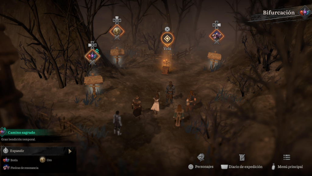 Los mapas cambian un poco cada vez, con objetivos variados: mata a todos, protege un punto, huye o defiende a un compañero. Y si fallas… pues mueres, pero no es game over total. Como decíamos antes, vuelves al campamento base con recompensas permanentes, desbloqueas habilidades nuevas para futuros intentos, fortaleces lazos entre personajes (que dan bonos en combate) y preparas reliquias mágicas. El mapa de la isla es como un árbol de decisiones: ¿vas por el mercader rico pero peligroso, o al campamento para descansar? Cada elección te da oro, piedras mágicas o eventos random entre los que se pueden encontrar quest con las que se nos unirán, de manera temporal, otros pèrsonajes. Es adictivo, porque sientes que cada fracaso te acerca al triunfo final.