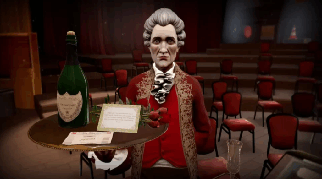 El control en PSVR2 es maravilloso. Tus manos reales aparecen en el juego, sin controladores, con precisión asombrosa durante las canciones (solo limitada por tu habilidad). Entre actuaciones, puedes interactuar con nuestro querido Eric, que te trae champán, deliciosos macarons o notas de admiración escritas por críticos, fans o publicadas en prensa.