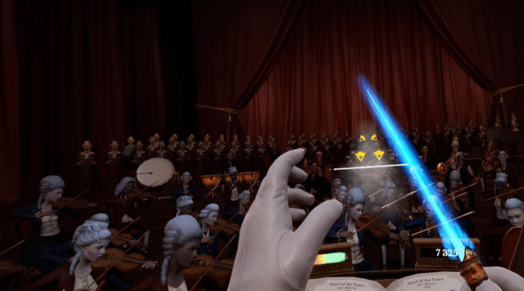El núcleo, la chicha de «Maestro», es su mecánica gestual, fiel al arte real de la dirección orquestal pero adaptada a un rhythm game accesible. En primera persona, enfrentas a una orquesta de músicos detallados que responden a tus comandos. La batuta derecha dicta el ritmo siguiendo flechas que avanzan: arriba para staccato, círculos para legato, sweeps amplios para fortissimo. La mano izquierda es multifuncional: apunta a secciones (cuerdas, vientos) para activarlas, eleva volumen con palma arriba o lo silencia con la palma hacia abajo. También encontramos acciones bilaterales como accents o fermatas que exigen coordinación, culminando en una sensación de poder absoluto cuando la orquesta obedece perfectamente.