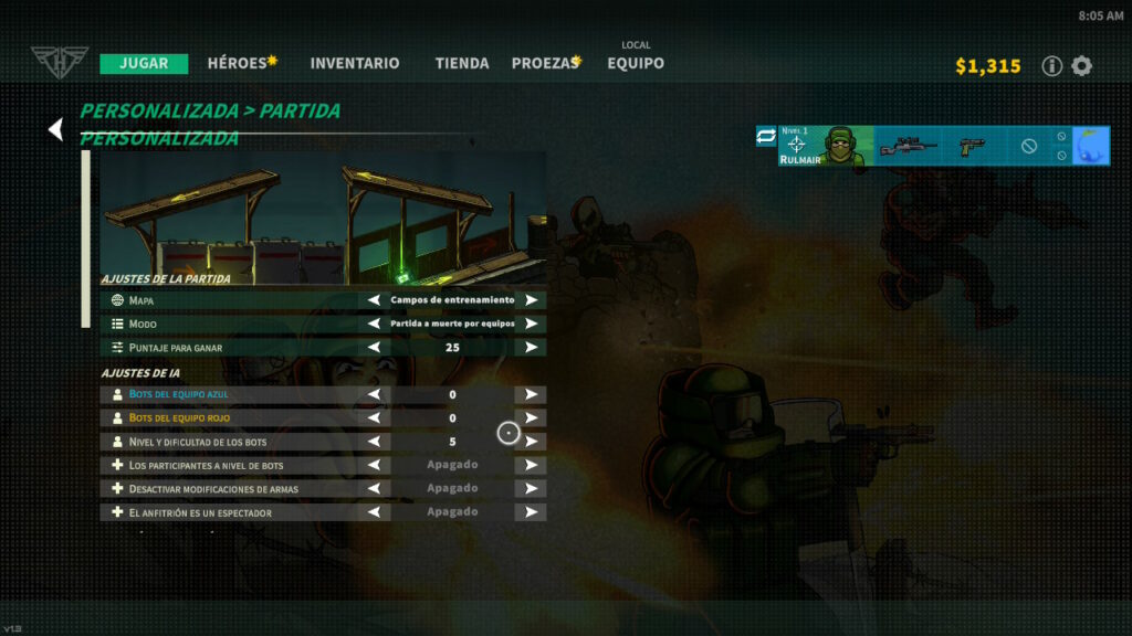 También tendremos ocasión de personalizar nuestras partidas para elegir el tipo de desafío que queremos disfrutar (captura bandera, dominio de zona, armas cambiantes, partida a muerte, etc.), así como el mapa o número de bots de cada equipo, entre otras modificaciones.