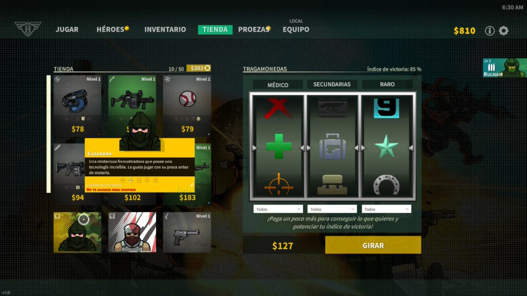 Cuando completamos cada misión, conseguiremos monedas, con las cuales podremos invertir en una tienda repleta de armas, atuendos, complementos, etc., así como una máquina tragaperras para probar suerte y conseguir equipo si se alinea en la línea central de la máquina.