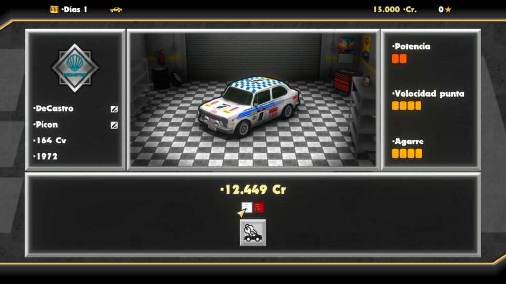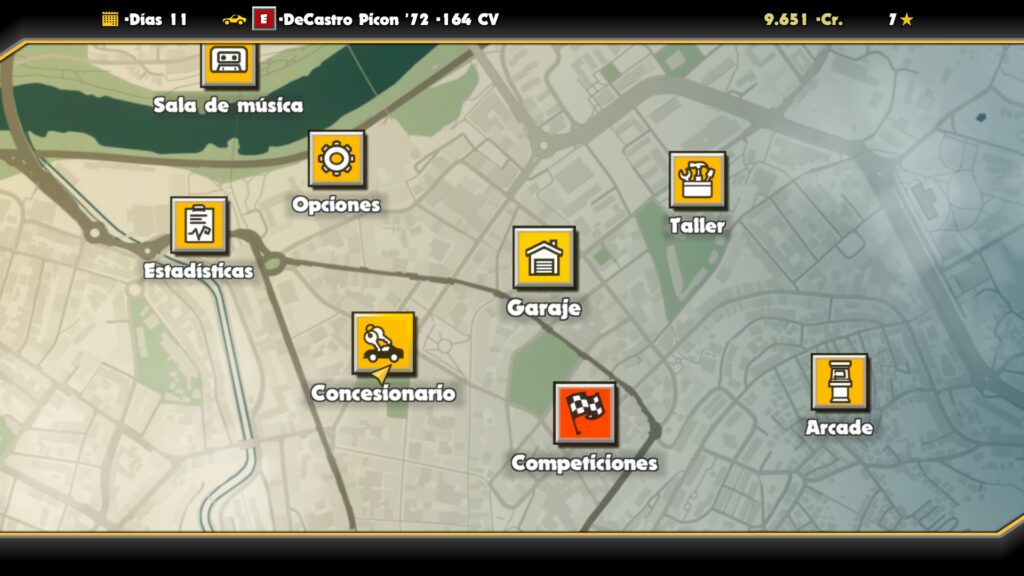 Si accedemos al garaje, podremos ver los coches de los cuales disponemos. Por otro lado, también podremos acceder al taller, donde se nos permitirá lavar el coche, cambiar el aceite, color y llantas, así como realizar mejoras de motor, potencia, ruedas, suspensiones, etc.