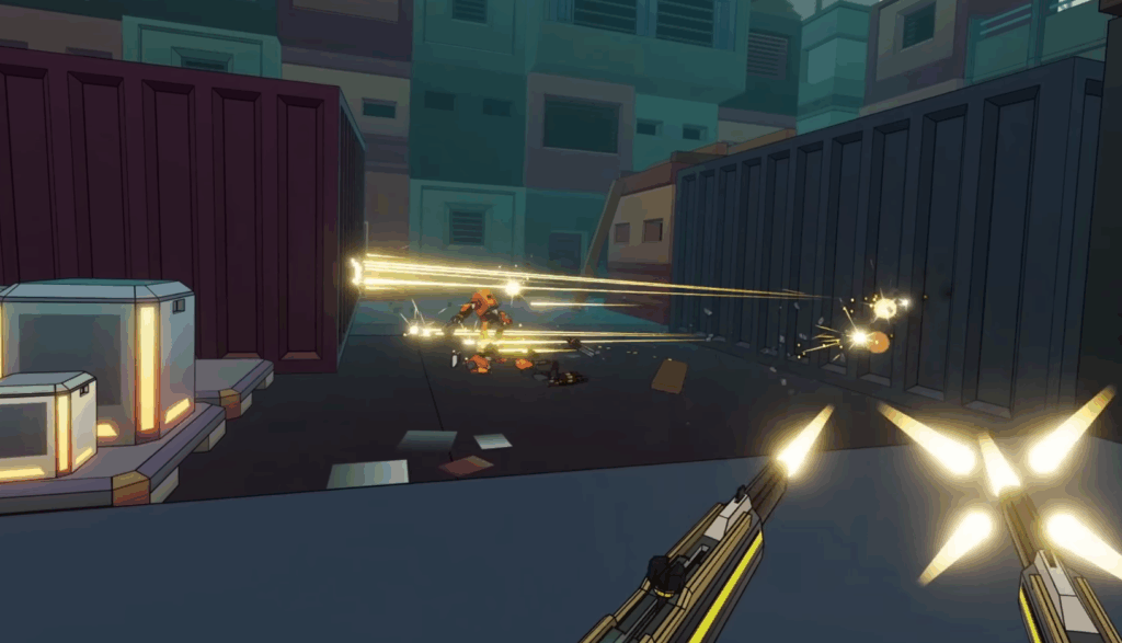 En lo visual, el estilo cel-shading con pocos polígonos brilla de manera estridente y futurista en PSVR2: colores vivos que saltan en la pantalla OLED (azules eléctricos, rojos intensos), imagen nítida y 90 imágenes por segundo sin apenas bajones, incluso en el caos más grande. Es cierto que no se trata de escenarios excesivamente recargados de mobiliario ni detalles, aquí se apuesta más por transmitir una sensación de futuro frío y aséptico, donde los robots dominan con cero gusto estético y máximo gusto por lo práctico. Muy futurista y eso… pero demasiado vacío.