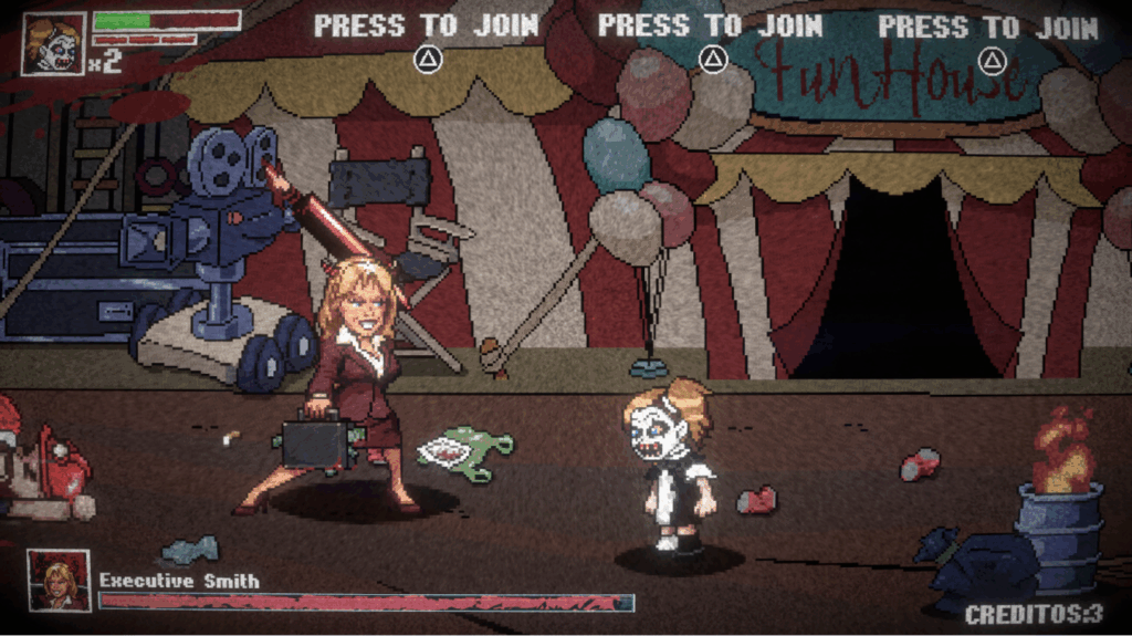 Los niveles son sets de cine: pasillos, exteriores, ¡hasta la mente de Art! Bosses épicos que hacen referencia a las películas, tanto dentro como fuera de la pantalla, como Leone o Sienna, con patrones simples pero frustrantes si vas solo. El combate es divertido pero se puede volver un poco simple al limitarse a buscar el golpe más rápido y bloquear constantemente a los enemigos, además sus controles algo tiesos y los enemigos, que se generan de manera aleatoria, son bastante repetitivos. El efecto de sangre salpicando la pantalla mola, pero puede llegar a saturarse y molestar a la vista. Desde luego no es Metal Slug, pero para rachas cortas mola el caos cooperativo que genera.