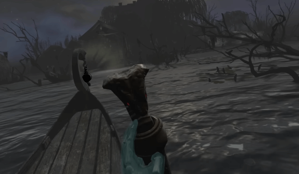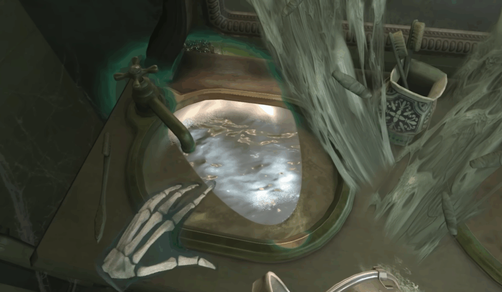 Este es el corazón, motor y virtud del juego: The 7th Guest VR es un festival de puzzles. Empiezas remando en una barca a través de la niebla (¡qué intro tan inmersiva!), y al llegar a la mansión, recibes una linterna espiritual que ilumina pistas, reconstruye objetos rotos y revela la versión «sana» de las habitaciones. Cada sala es un rompecabezas interconectado: resuelves uno para desbloquear el siguiente, y al completarlos todos, la habitación se restaura a su gloria pasada, con colores vibrantes y sin telarañas.