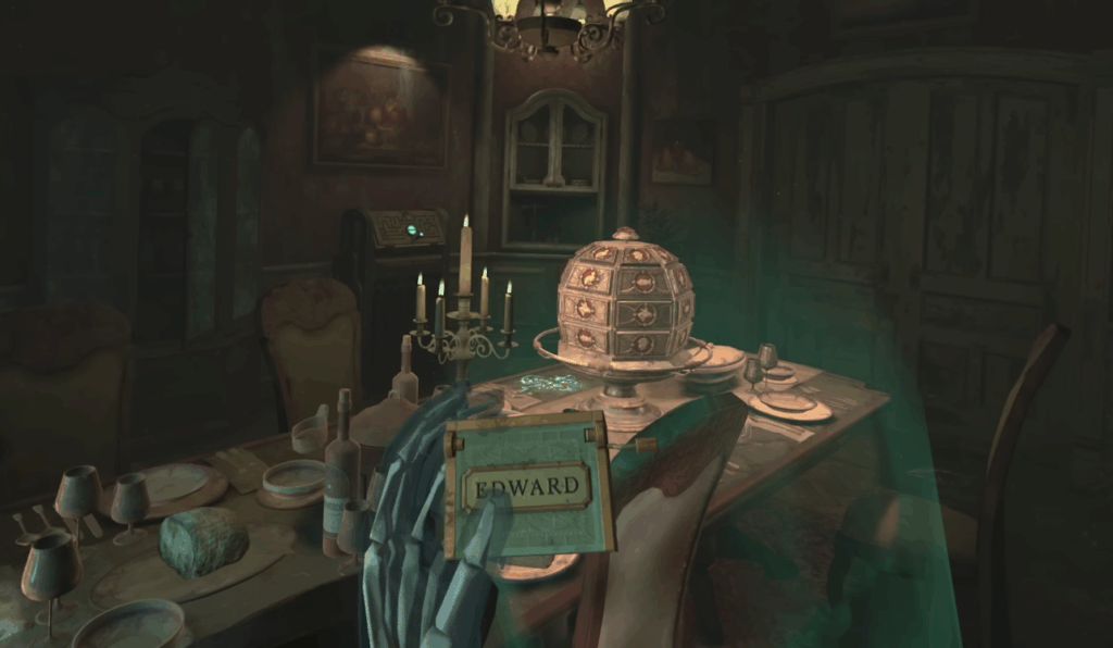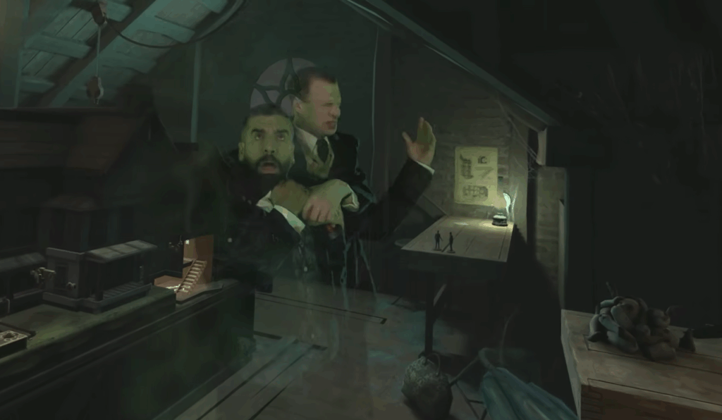 Lo que eleva esto a juego excepcional es la VR. No es solo point-and-click ya que interactúas físicamente: agáchate para ver bajo mesas, gira la cabeza para pistas ocultas, camina alrededor de hologramas. La linterna es un añadido genial, con ella apuntas y revela mundos superpuestos. De un mueble sucio y polvoriento a uno lustroso, de un montón de sillas rotas a un delicado y acogedor rinconcito para tomar el té… y ya si enfocas a los cuadros es cuando alucinas.