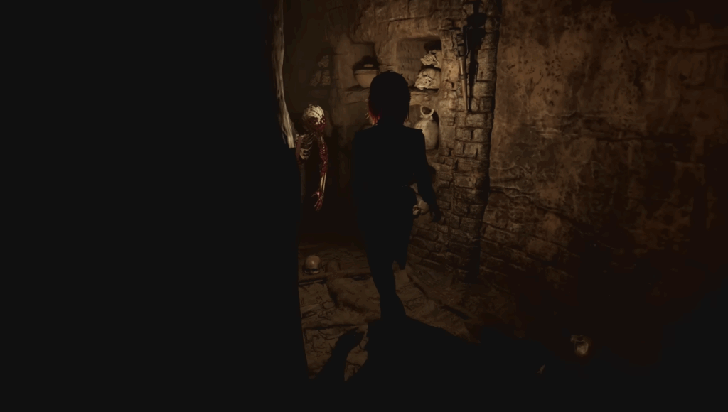 Los escenarios, repletos de imaginería, santos y vírgenes en penumbra, le da un toque tenebroso muy interesante. A esto se suma la iluminación dinámica, que es magistral con ese mechero que porta Caroline y que parpadea en la oscuridad, creando sombras que juegan con tu paranoia (ella tiene fotofobia, lo que añade capas al terror psicológico y hace que no puedas permanecer en zonas oscuras).