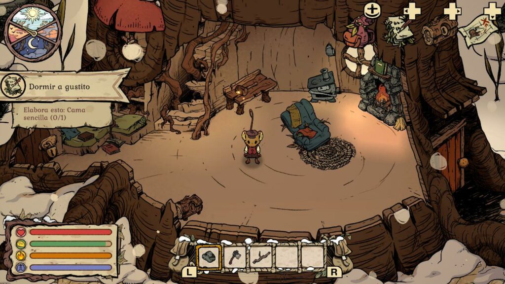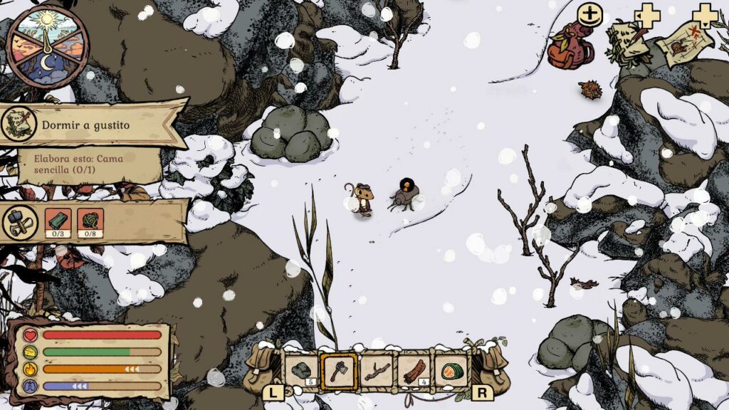 Todo esto lo conseguiremos saliendo por el bosque y buscando materiales, pero hay que tener en cuenta que nuestra barra de frío y el tiempo son muy importantes, y corren en nuestra contra. Así, nuestras exploraciones en un primer momento deberán ser cortas, con el fin de llegar a tiempo a nuestro hogar para no mermar nuestra energía. Más adelante, con mejores ropas para afrontar el frío y nuevas herramientas, podremos ir avanzando un poco más lejos.