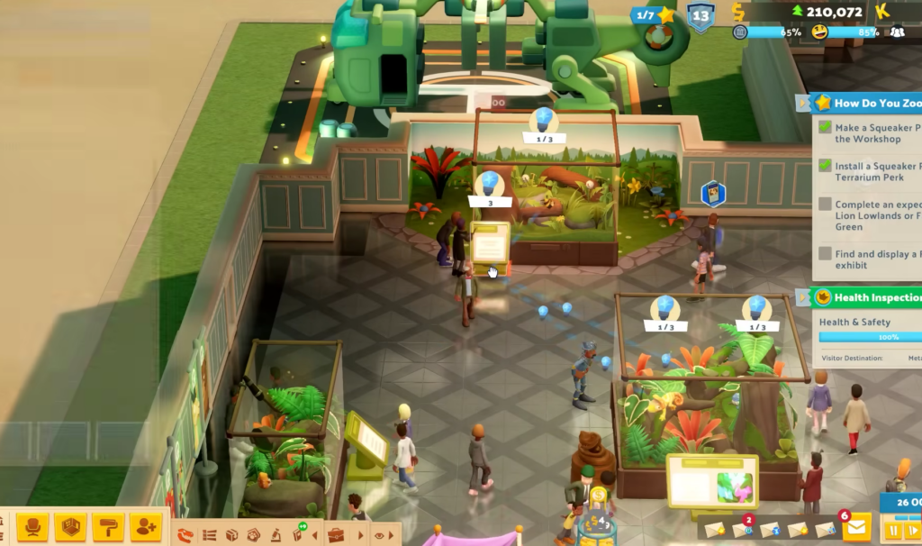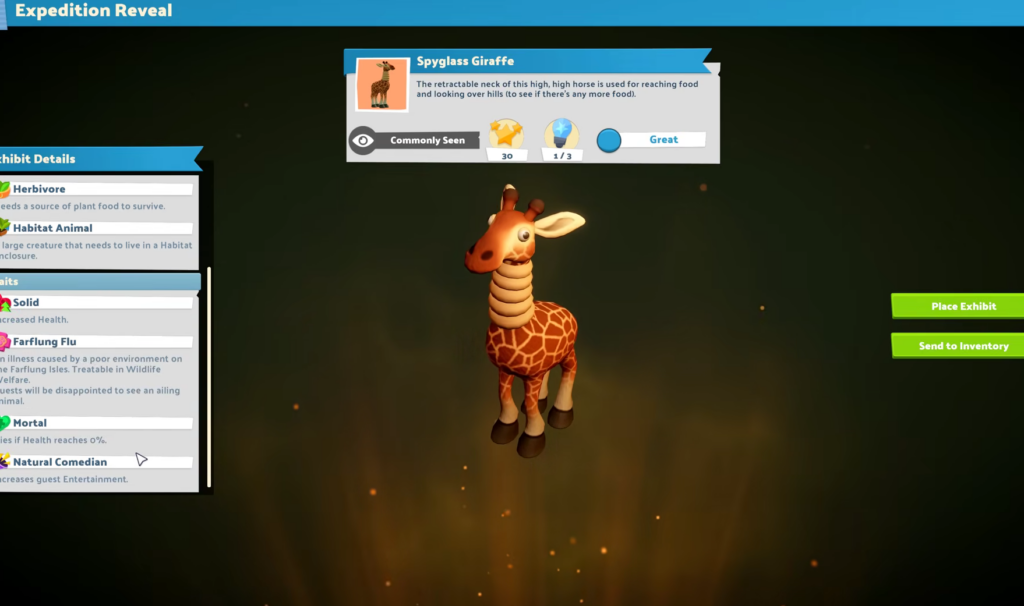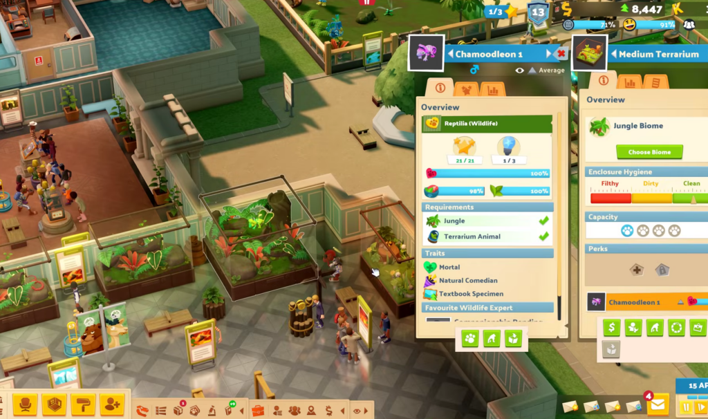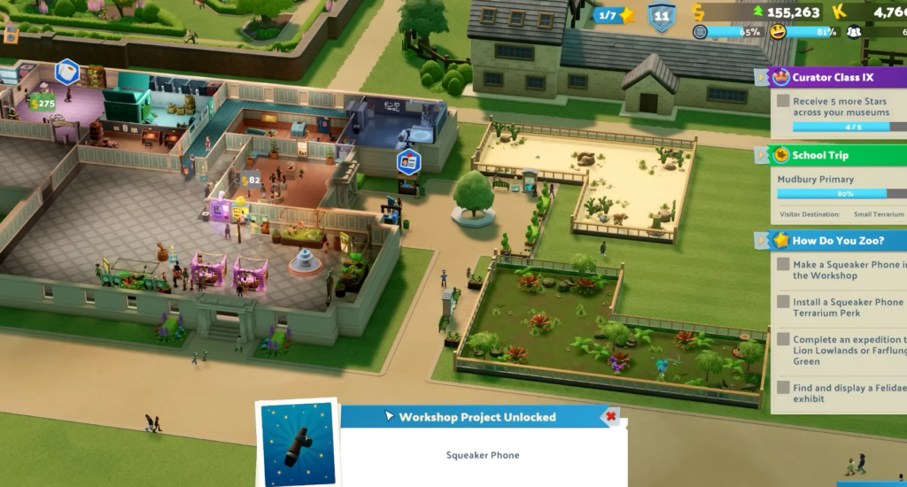 Cada criatura tiene necesidades específicas: dieta (insectívora, herbívora…), compatibilidad (¡casi nadie se lleva bien salvo el unflappybara, que es adorable!) y requisitos de espacio. Los cazadores pueden comerse a los herbívoros si no los separas bien… y tenemos el drama garantizado. Los displays interactivos como el Snake Slide o el Gazelle Spring Ride hacen que los visitantes paguen más y se vayan con energía extra. Y sí, puedes poner estos hábitats en cualquier museo anterior: imagina añadir una manada de zig-zebras al ala de historia antigua. Caos total y garantizado.