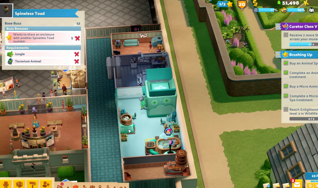 Imagina a tu Experto preferido siendo el ídolo de un león dandy o de un capibara unflappybara (sí, existe y es el animal más zen del juego). La habitación Wildlife Welfare es absolutamente imprescindible para este sistema de juego: aquí curas el Farflung Flu con tratamientos tipo spa, analizas muestras y “Re-Animilas” a las criaturas. Es mecánicamente adictivo y visualmente hilarante: ver a un experto dando masajes a un escorpión flor de cactus es puro humor «Two Point».