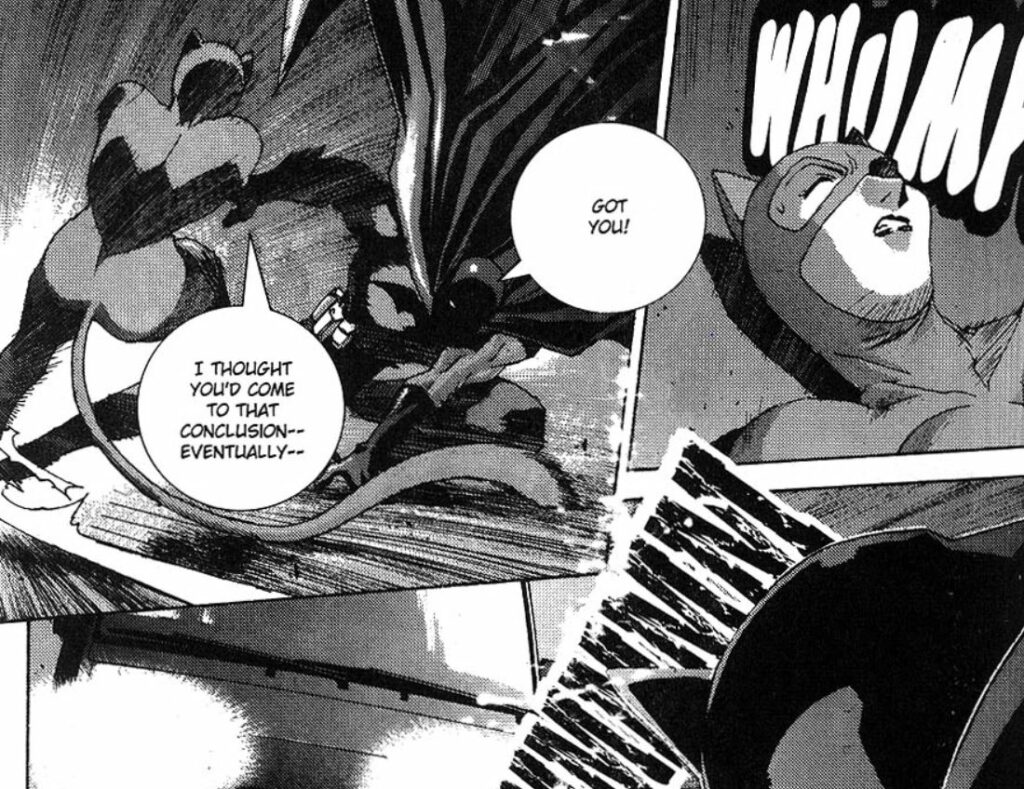 Antes de eso, Kia Asamiyase preocupa de colocar en Gotham a los principales adversarios de Batman, Joker, Acertijo, Dos Caras y Pingüino. Luego se las ingenia para darnos su versión de Catwoman en el otro lado del Pacífico, pero esta sucesión de villanos no obedece a una pura vocación comercial o a una necesidad caprichosa por jugar con todos los juguetes, sino que su justificación es el elemento nuclear para todo el desarrollo de la acción, desde el principio hasta el final.