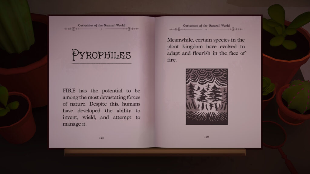 Botany Manor es un juego en primera persona en el que mediante la solución de puzzles germinaremos semillas, que se convertirán en pequeñas plántulas que finalmente haremos florecer. Diseminadas por la casa o los jardines encontraremos paquetitos que contienen esas semillas y cerca de ellas encontraremos pistas a modo de libros, cartas, pinturas…que organizaremos en el libro en el que estamos trabajando y que serán clave para que estas plantas florezcan y nos permitan completar nuestra investigación. Hay que prestar atención porque aunque hayas descubierto la pista y la hayas incluido en el libro, para volver a consultarla hay que acudir al lugar donde la has encontrado ya que no se guarda en el inventario.