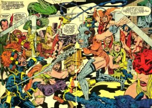La gloria la obtenemos con “¡El Pacto !”, correspondiente al nº 7 de New Gods y al que me refería en el apartado de Mister Miracle. Se convierte sin ninguna duda en uno de mis episodios favoritos de toda la obra descubriéndonos el alzamiento Darkseid. Evocando tragedias griegas en crossover con las de Shakespeare al arbitrio caótico e imaginativo de Jack Kirby, se estrenan el cinematográfico Steppenwolf y Heggra, la madre del gran villano. La doble página representando una deflagración bélica con aparatos móviles aéreos, soldados con armaduras metálicas inverosímiles y maquinaria pesada inundada de explosiones sirve de preludio para demostrar la profundidad psicológica de la epopeya que escondía el dibujante bajo sus desbordantes ideas.