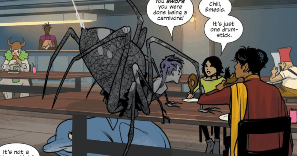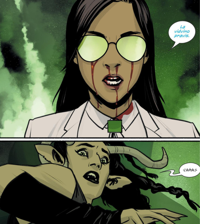 Y antes de ese mega-giro… ¿qué pasa? Pues lo dicho más arriba: nuevos personajes, situaciones curiosas y divertidas, muy buen guión y dibujo fantástico, pero con poco fondo. Y no nos referimos solo al fondo real, al dibujado por Staples, que sigue siendo ridículo e inexistente. La artista basa su narrativa visual en los personajes y se apoya en su magistral y absoluto talento para recrearlos de manera impresionante. Mejora esto con los diálogos fluidos y perfectos de Vaughan y tienes un cómic sensacional.