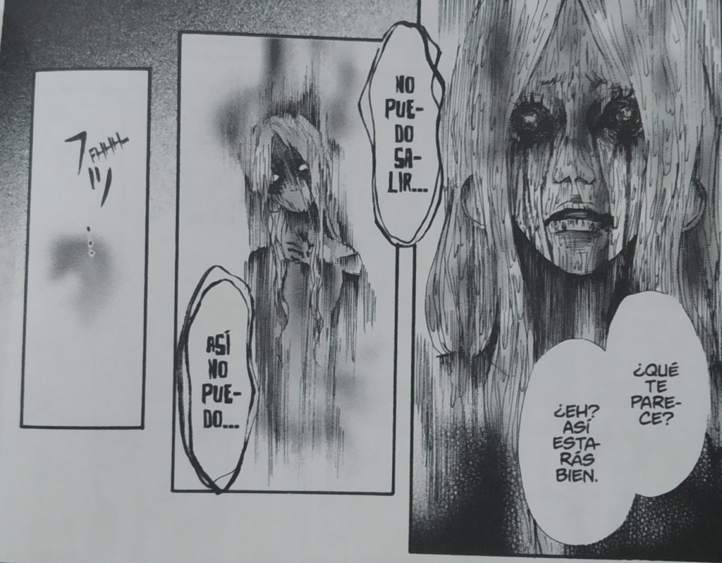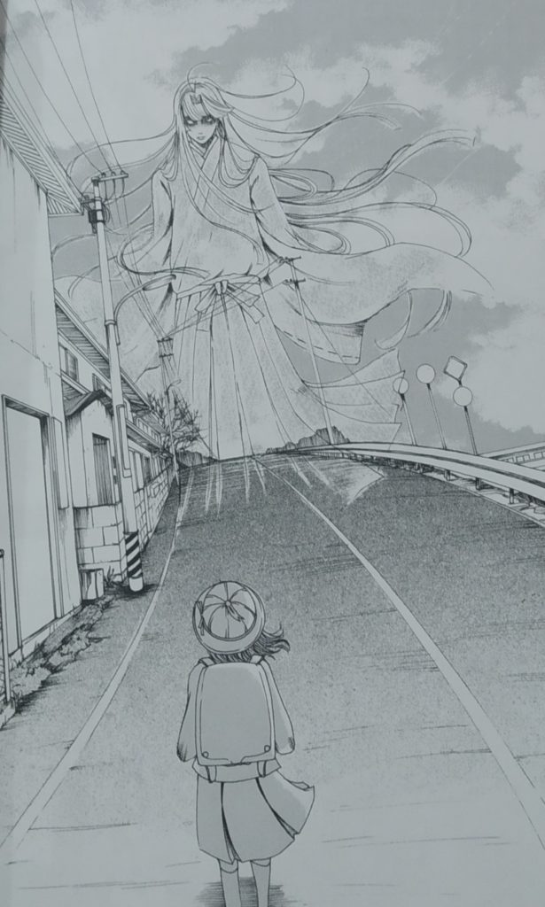 Artísticamente su estilo es muy similar a otros talentos dentro del género, como el mismo Junji Ito. Trazos firmes y elegantes que dibujan rostros y figuras estilizados, combinados con un detalle cuidado en los escenarios y reforzado con un diseño de lo sobrenatural realmente destacable. En algunas ocasiones los espectros son pavorosos, inquietantes… surgen de las sombras y se muestran en todo su horror. La autora sabe captar cada una de esas presencias con mucha solvencia. Incluso en el relato en el que aparece un ser de origen y procedencia ambigua, una especie de ente cercano a un dios o un vigilante de otra dimensión (es difícil determinarlo) consigue dotarle de presencia y entidad, imponente… como podéis comprobar en la imagen de la derecha.