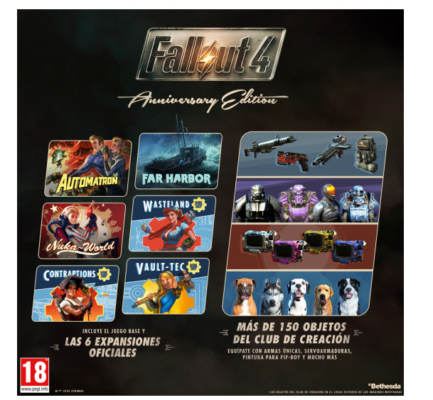 Fallout 4: Anniversary Edition es la culminación de una década de recuerdos y aventuras en el Boston posnuclear, e incluye el juego base y los seis complementos de contenido descargable oficiales, lo que supone la versión más completa del juego hasta la fecha, tanto para recién llegados como para veteranos. Esta edición también cuenta con más de 150 elementos de contenido del Club de creación, que incluyen clásicos favoritos y nuevas adiciones, lo que te permitirá dar un toque novedoso y original a tus experiencias por la Commonwealth. Los jugadores podrán disfrutar de más de 100 horas de contenido con esta edición.