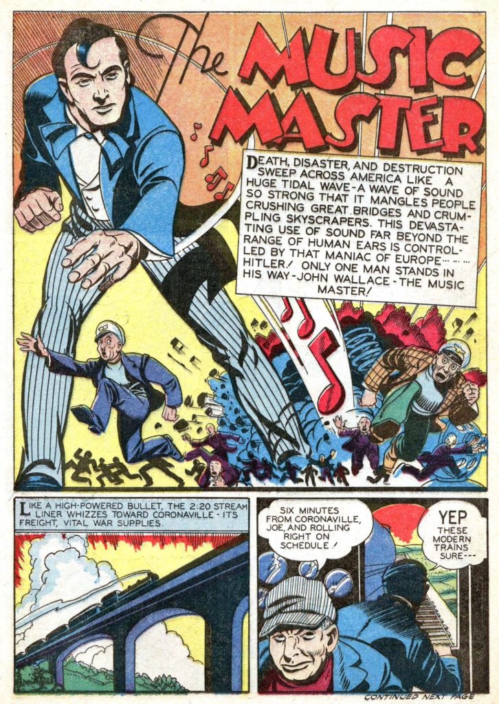 La editorial Libritos Jenkins nos trae una auténtica joya del cómic de super-héroes, rescatada de la Edad de Oro y por primera vez en nuestro idioma. Nada menos que The Music Master, un curioso personaje que lucha contra el mal con poderes extraídos de la música. Se trata de John Wallace, un violinista que revive gracias a la melodía que interpreta una flauta mágica (y egipcia) volando sobre pentagramas y elegantemente vestido. Entre 1941 y 1945 fue publicado por la editorial Reg’lar Fellers en la revista Heroic Comics. Sus creadores fueron dos mitos de la industria: Stephen E. Douglas y Bill Everett.